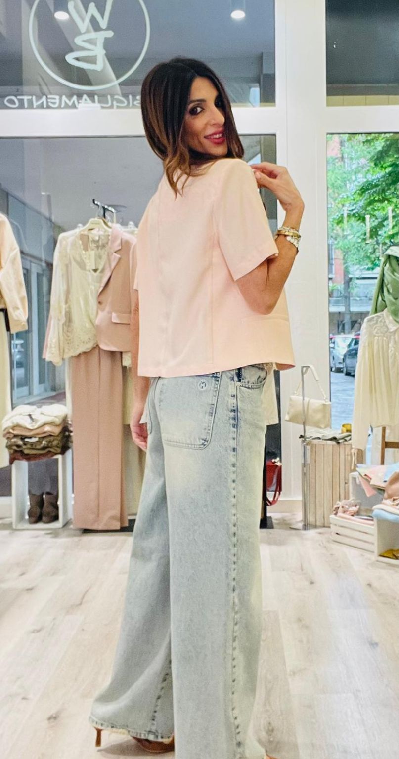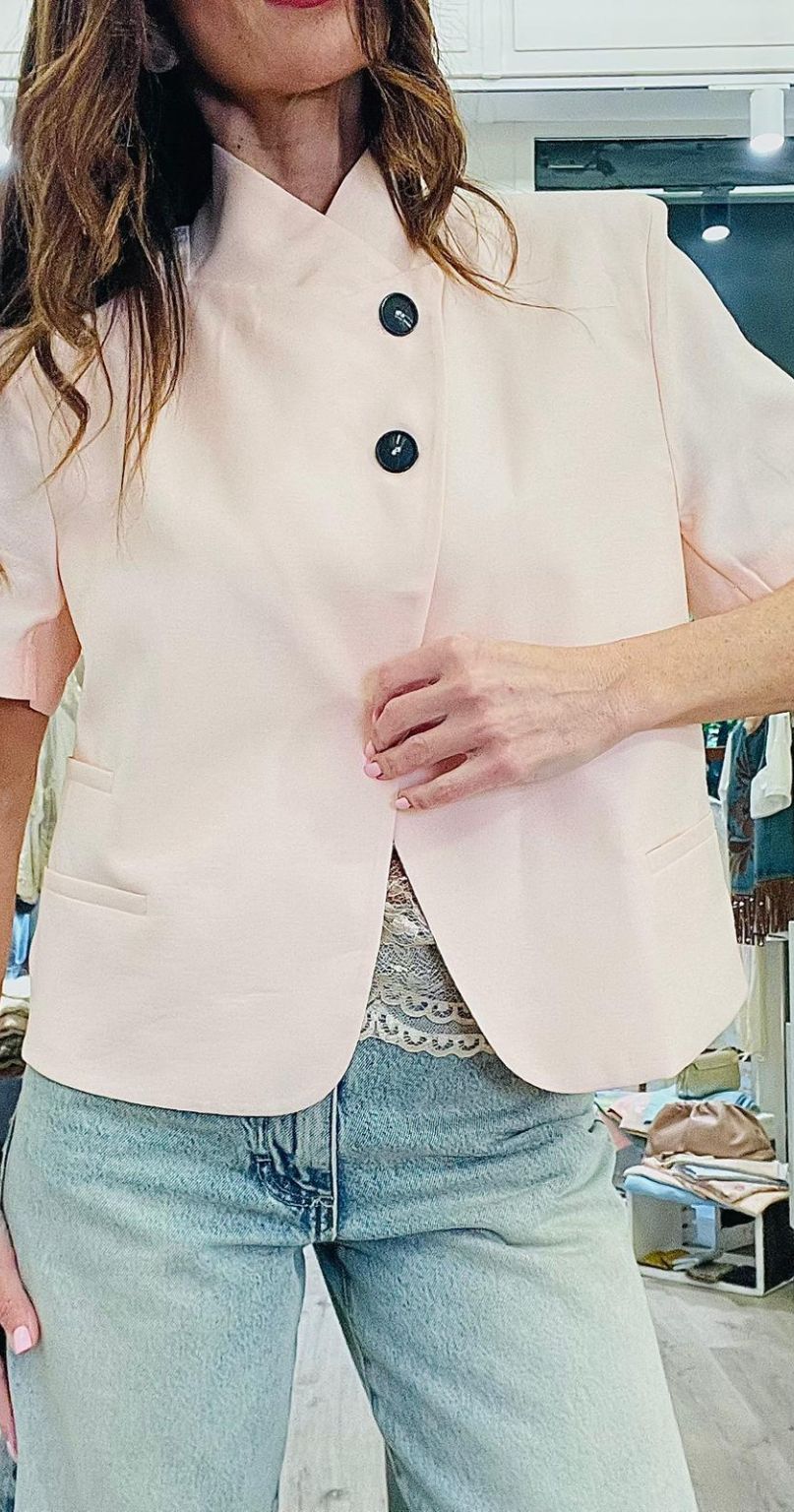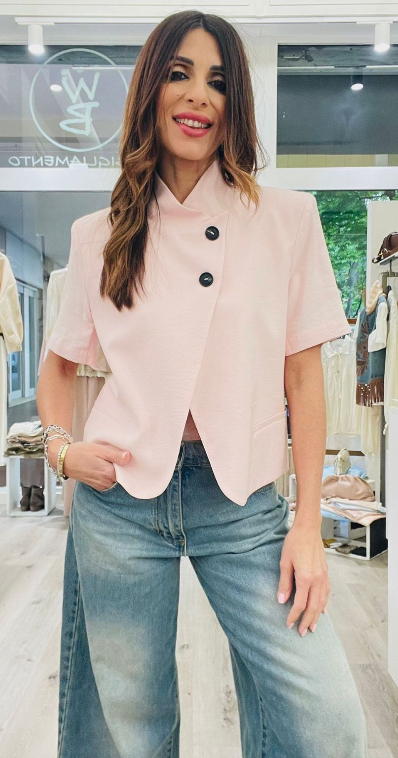 Giacca mezza manica in viscosa con collo alla coreana incrociato e doppio bottone con abbottonatura trasversale.
