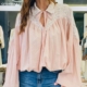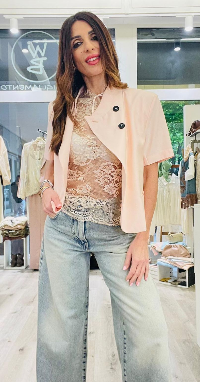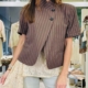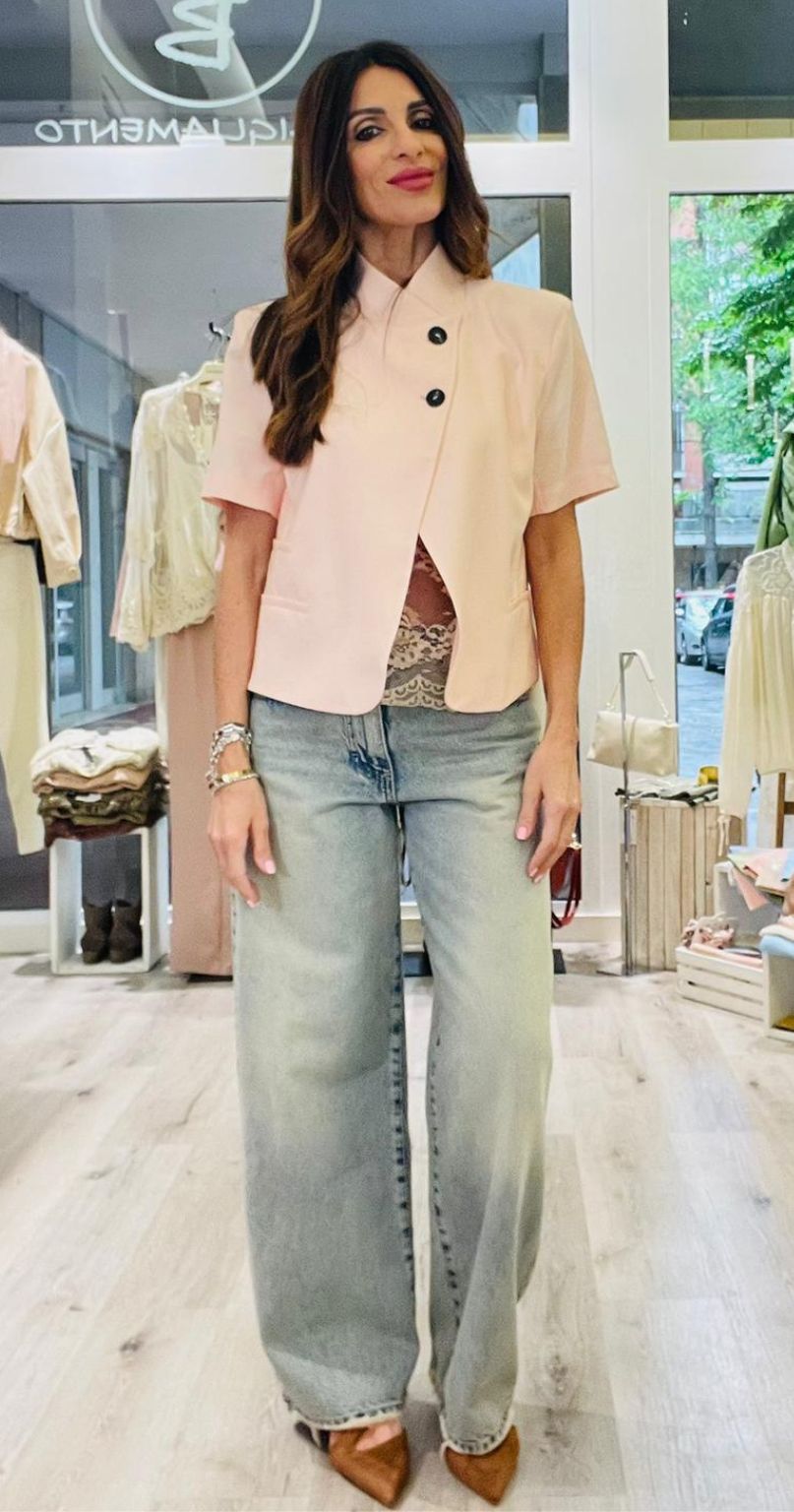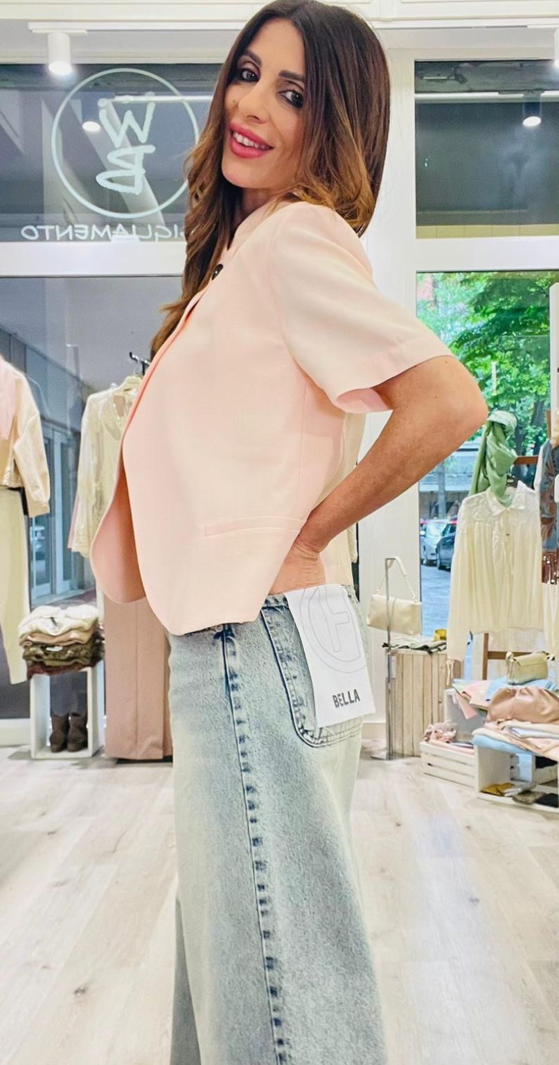 Giacca mezza manica in viscosa con collo alla coreana incrociato e doppio bottone con abbottonatura trasversale.