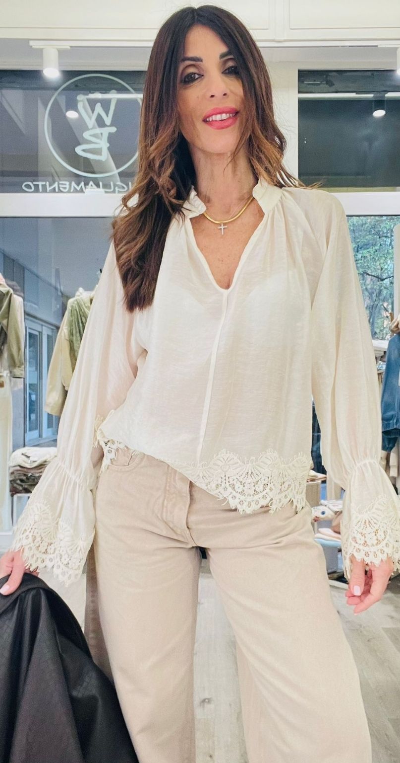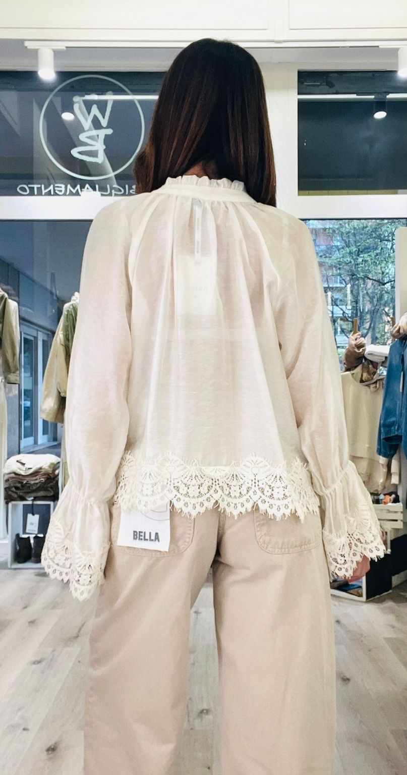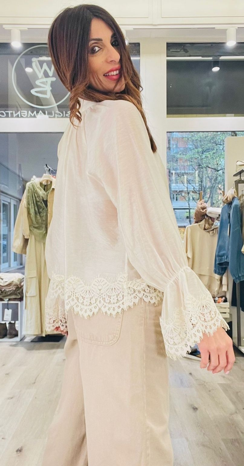 Blusa in organza con scollo a v e inserti in pizzo sul fondo e sulle maniche