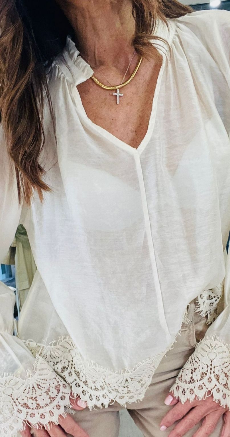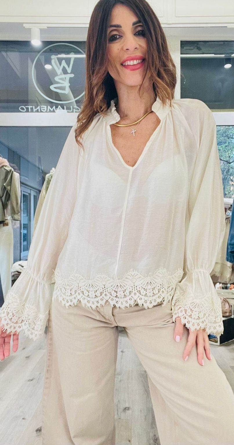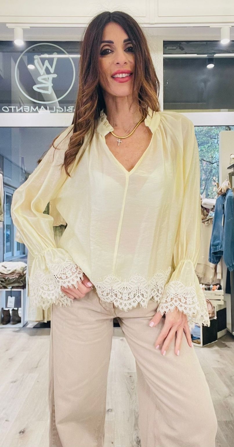 Blusa in organza con scollo a v e inserti in pizzo sul fondo e sulle maniche