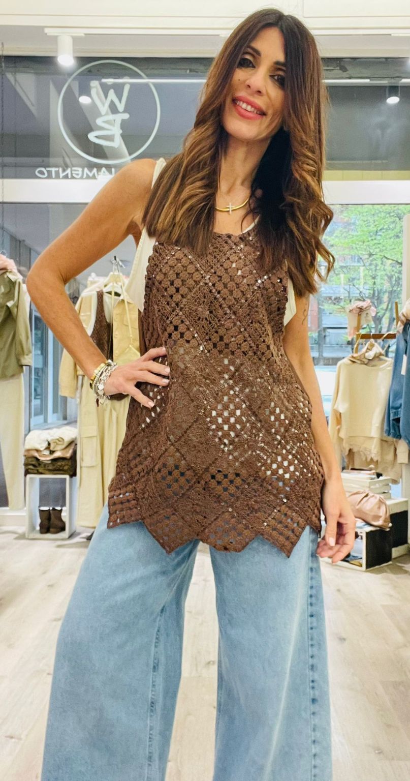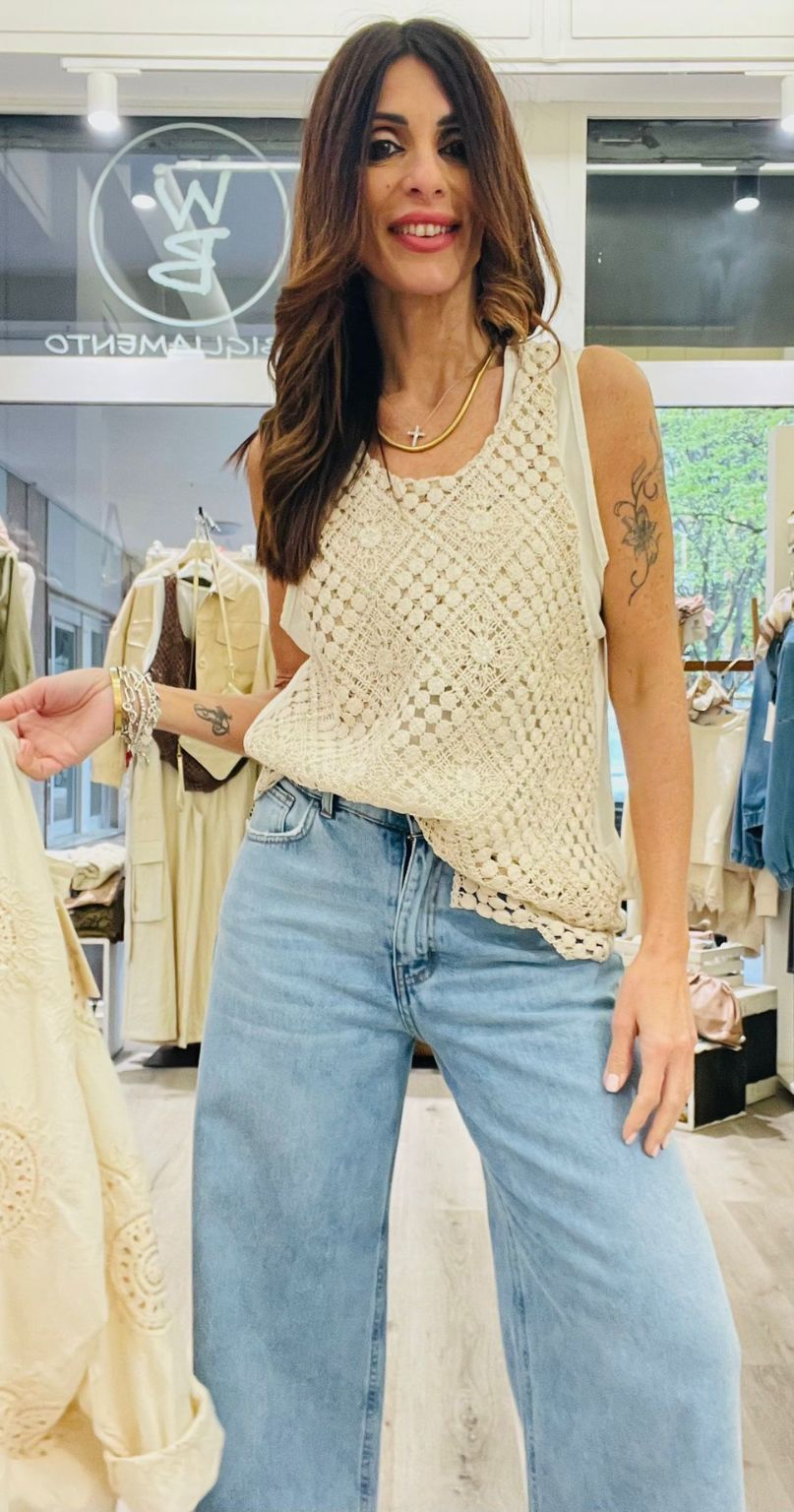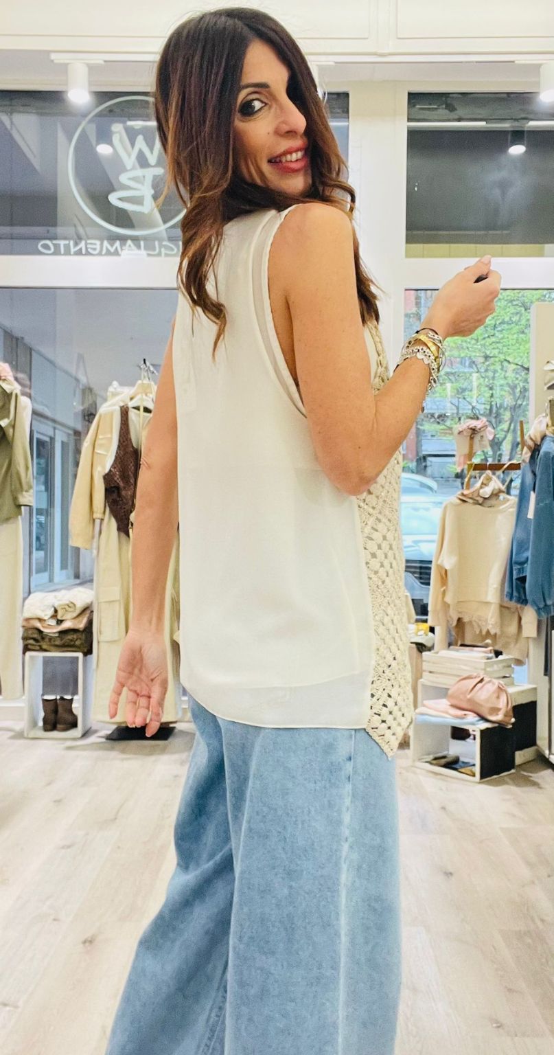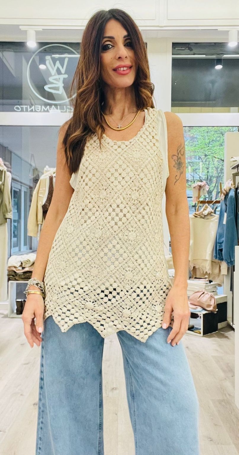 Susy Mix canotta doppia in tulle e macrame’