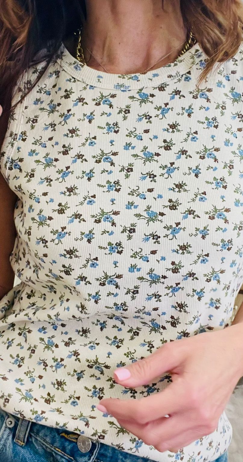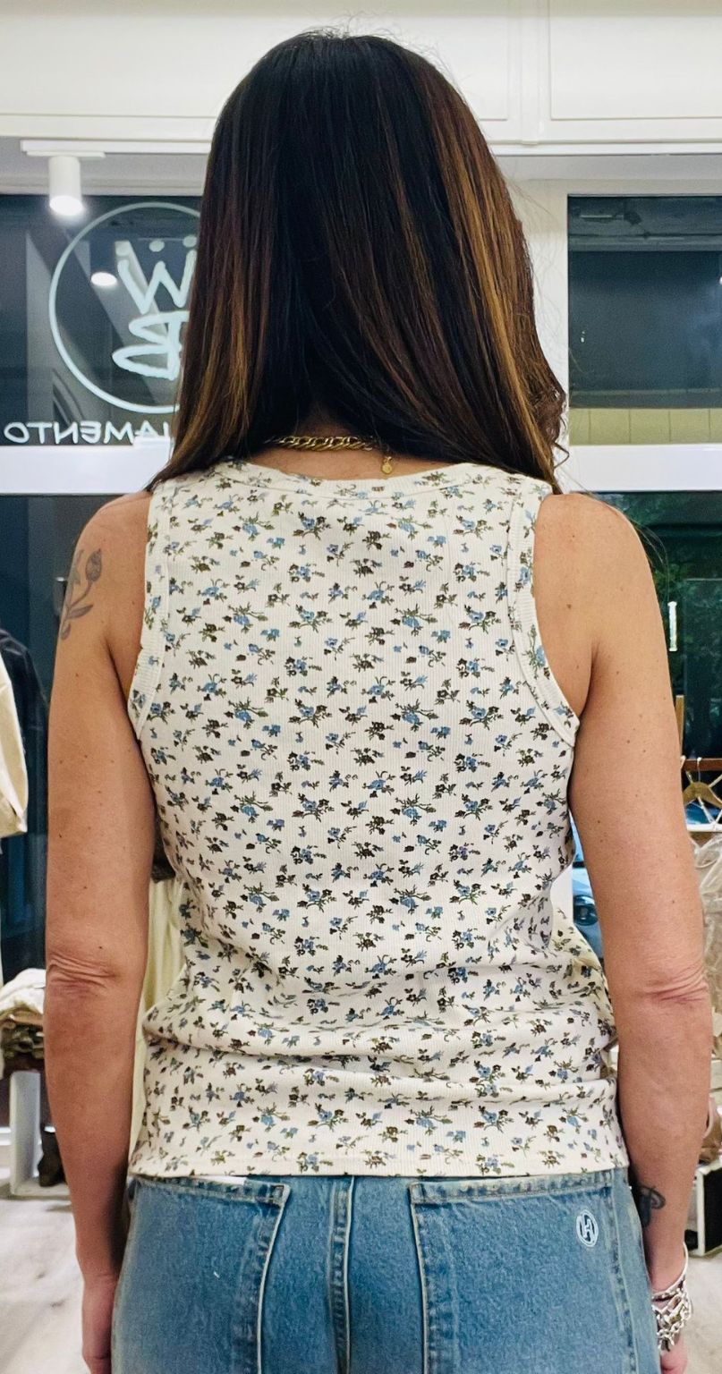 Canotta in cotone a costine con scollo all’americana, fantasia a fiori