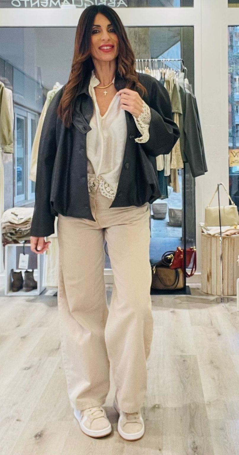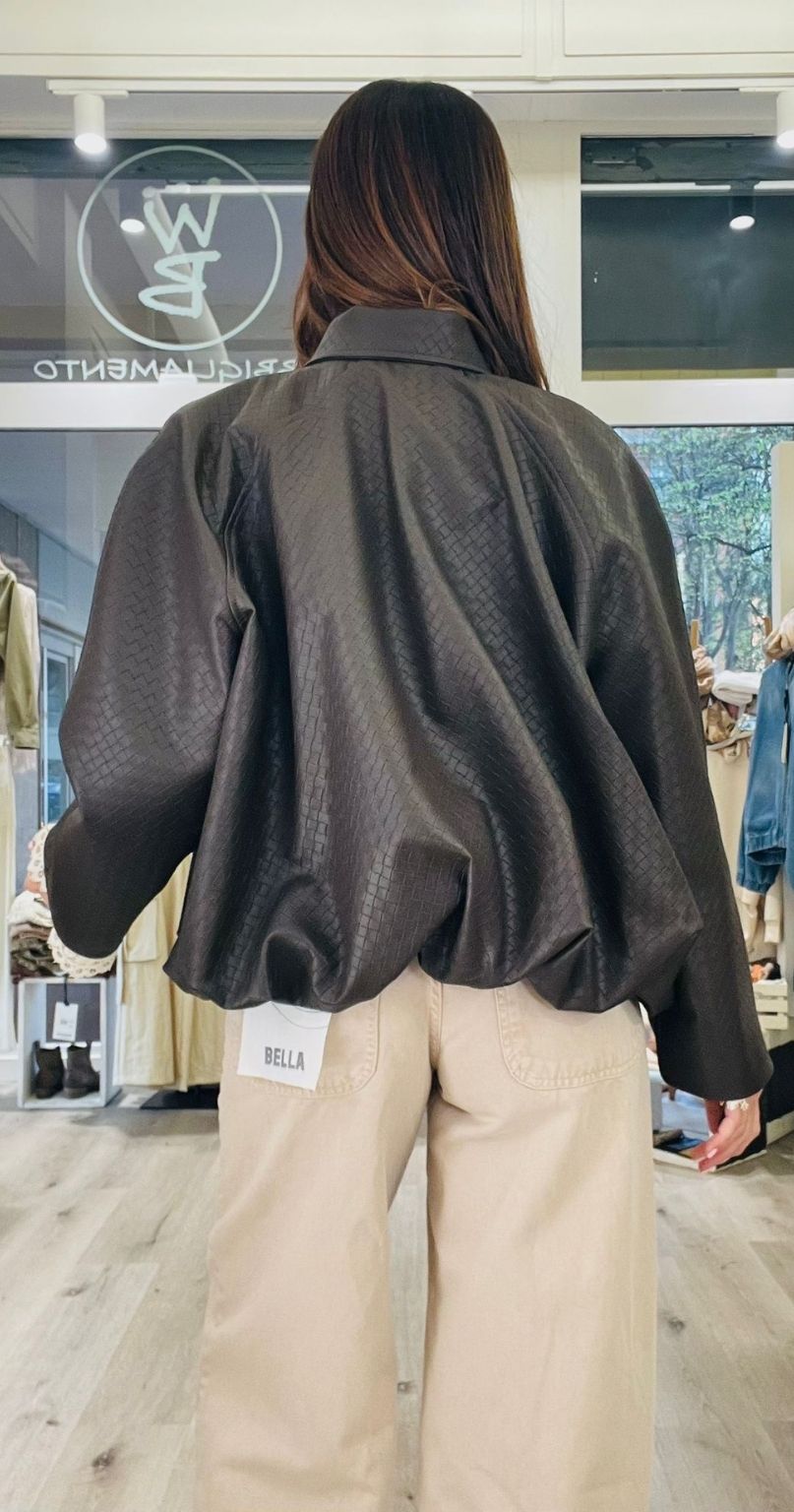 Bomber in ecopelle intrecciata e fondo arricciato all’interno.